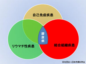 膠原病とは、皮膚や内臓の結合組織や血管に炎症・変性を起こし、さまざまな症状を起こす病気の総称、のことを指します。