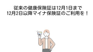 クリニック情報 12月2日から従来の保険証が使えなくなります 健康保険証は、原則としてマイナンバーカードと一体化(マイナ保険証)されました。従来の健康保険証は令和7年12月1日で廃止されるため、12月2日以降はマイナンバーカードを健康保険証として利用することが基本となります。マイナンバーカードをお持ちでない方は、一定期間内で「資格確認書」で受診することは可能です。 2025.11.11 クリニック情報